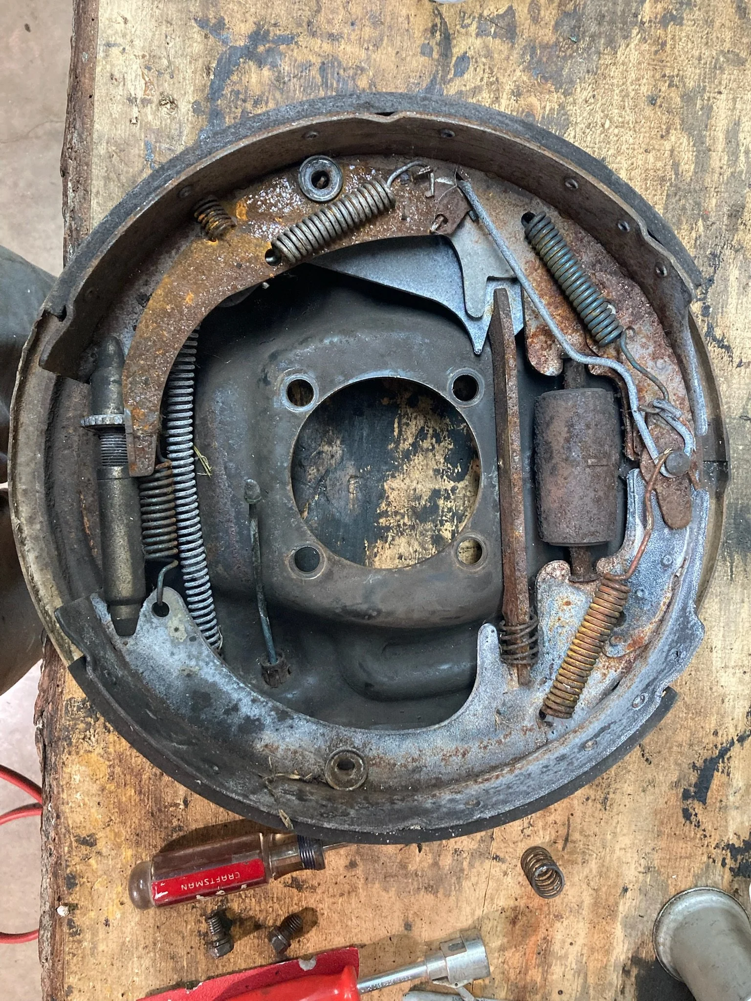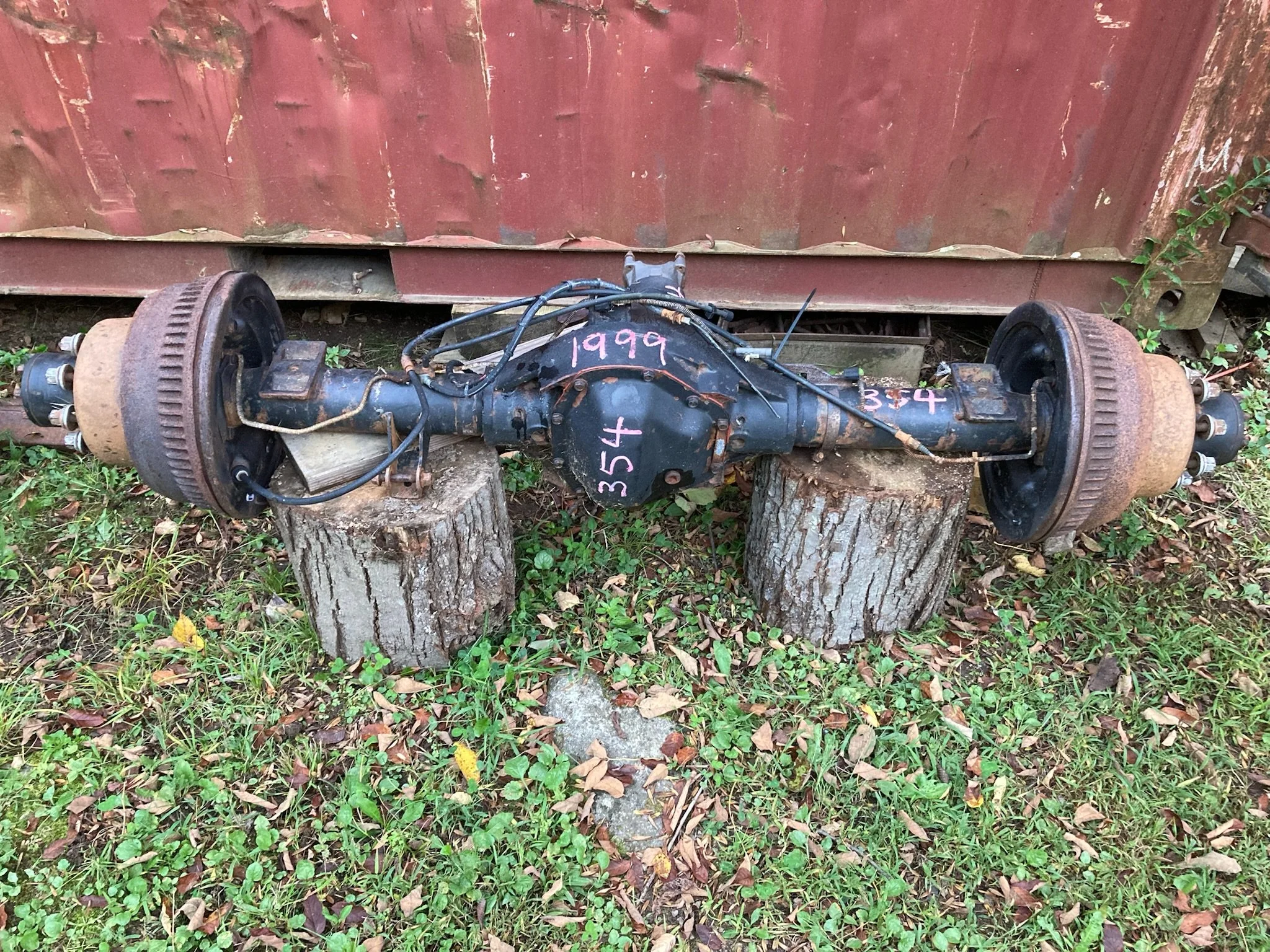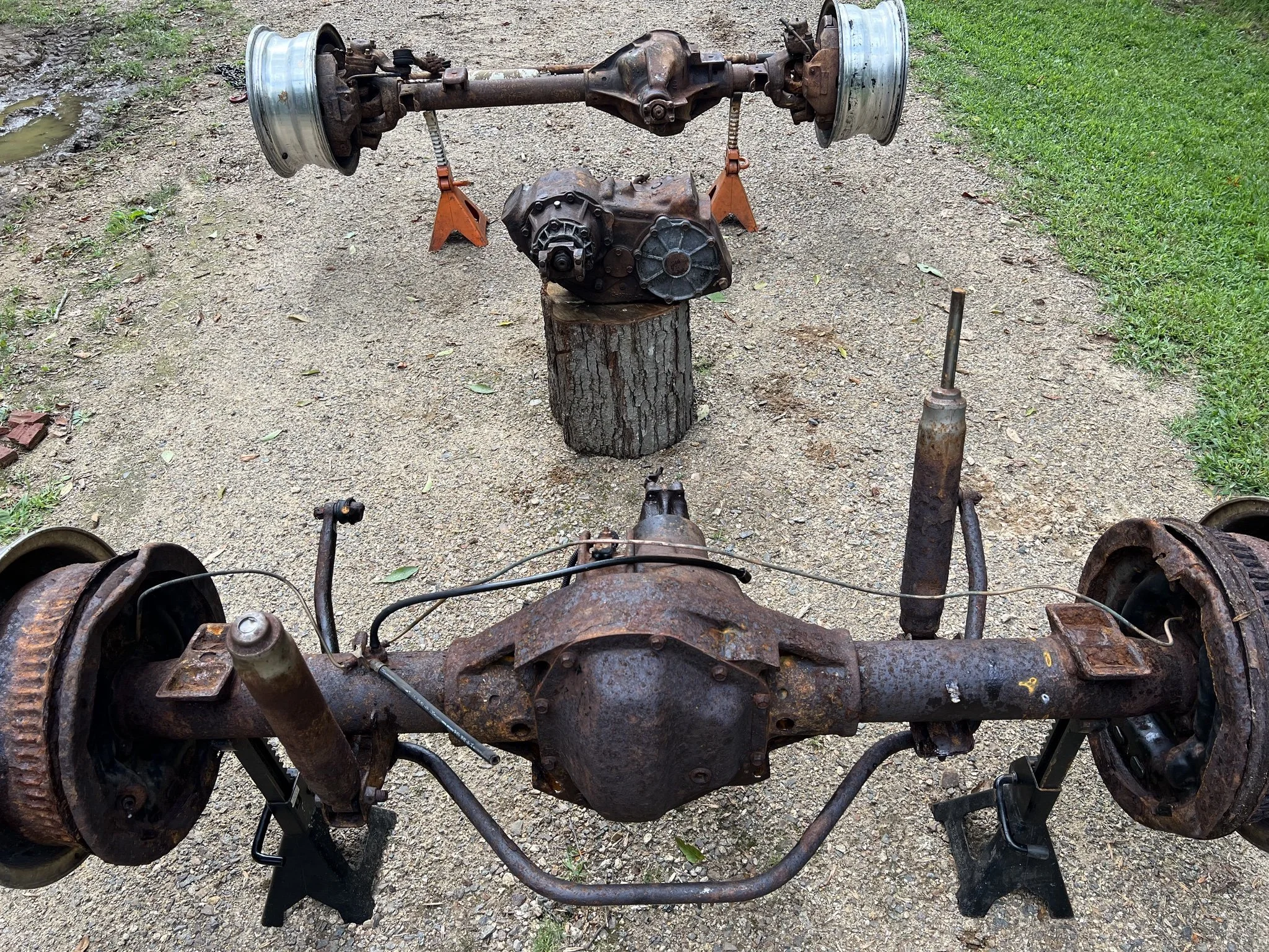 Our first find was a retired plow truck listed on Marketplace. We bought the axle for $450 and pulled it ourselves. Unfortunately, once we got it home we discovered the drum brake backing plates were completely rotted out—unsurprising given its life as a plow truck, but replacements were nearly impossible to source. We sold that axle and resumed the search.